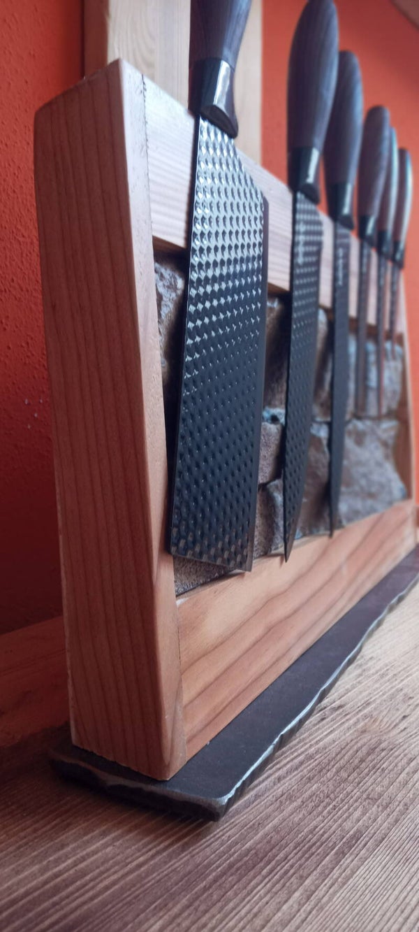 Messerblock aus Altholz mit eingearbeitet Steinoptik und Eisensockel 40 x 23 x 5 cm