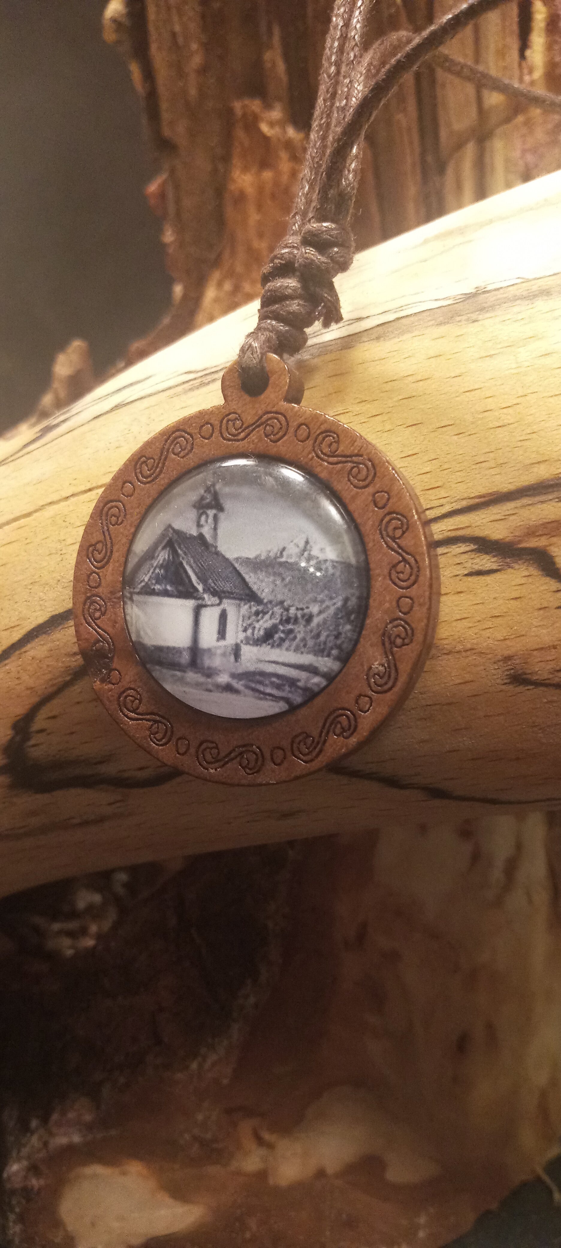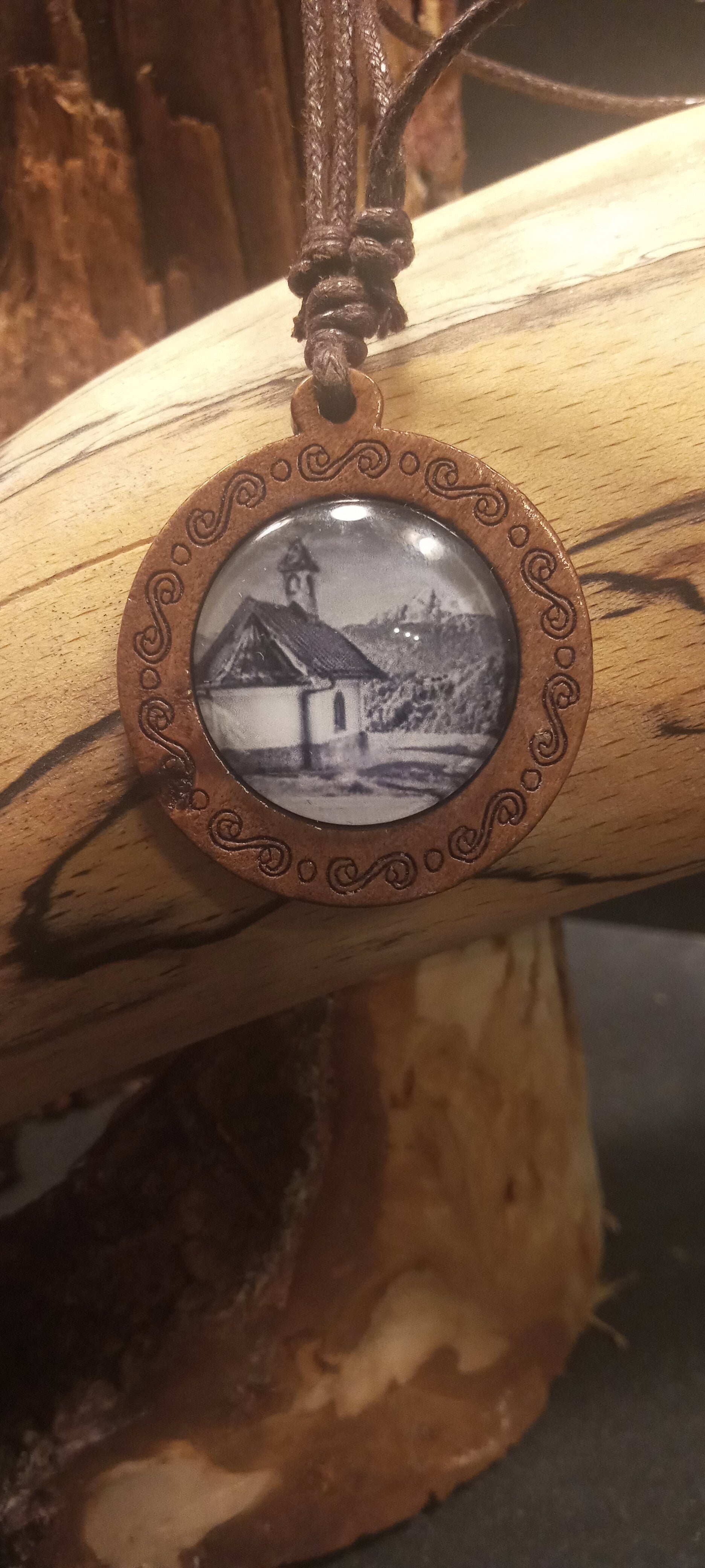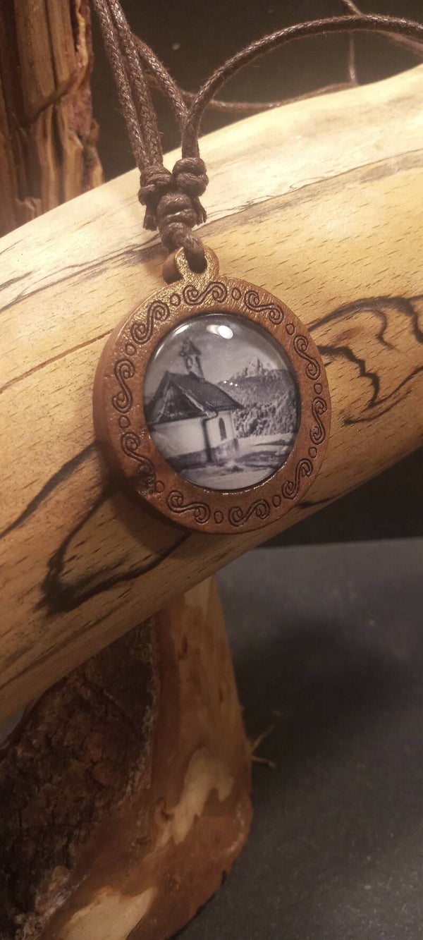 Dieses exklusive Lederhalsband verbindet rustikale Eleganz mit einem Stück bayerischer Heimat. Ein besonderes Highlight ist das handgefertigte Holzmedaillon: Im Inneren verbirgt sich eine detailreiche Abbildung der berühmten Kirchleitnkapelle am Lockstein in Berchtesgaden.