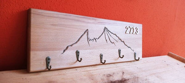 Schlüsselbrett aus Massivholz mit Watzmannfräsung und Höhenangabe.Inklusive Aufhängung auf der Rückseite.